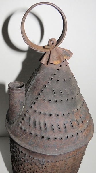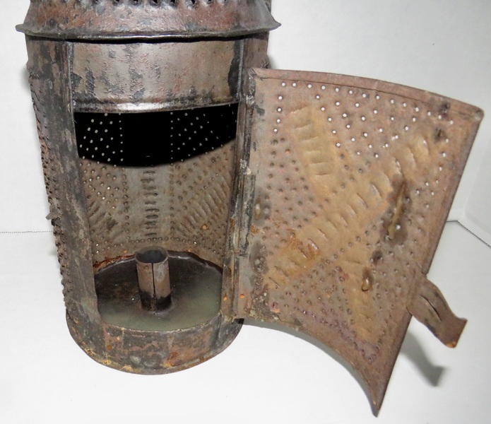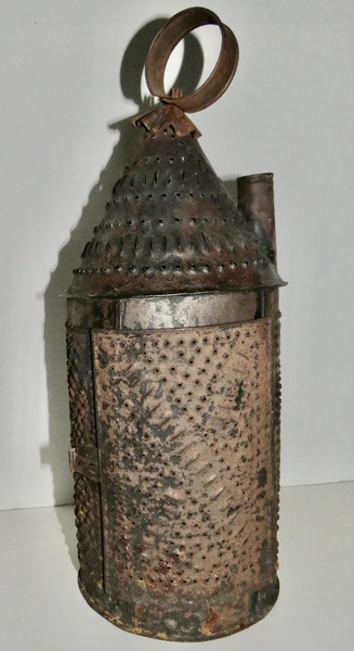 Punched tin barn lantern with candleholder on dome. The inside candle socket is tabbed through the bottom, typical of early tin lanterns. It has a 15” hanging height x 5 3/4” diameter base. The punched design is a crossbar X. There are no issues and only minor surface rust. 18th c. The candle cup on the dome was for use inside the home. Lanterns with a candle socket on the dome are not commonly found.