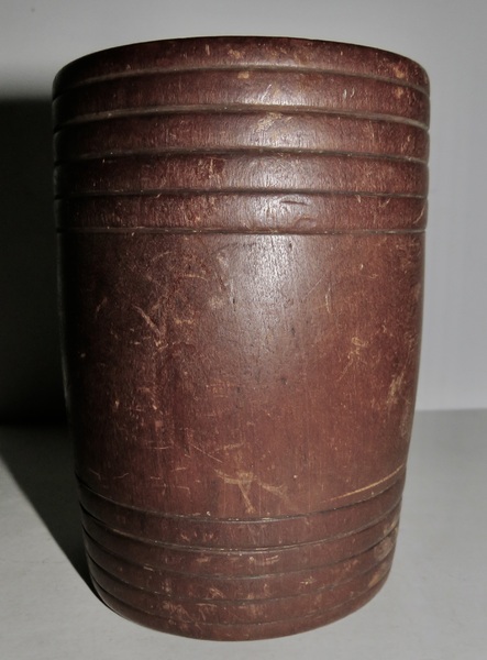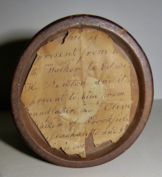 Rev. War period maple with pine ends rundlet with an early cork stopper and original brown stain. Stuck on one end is a paper with a history from MA. In part it reads in part: “This is a present from … tte? to Edward H. Newton and it is a present to him from … grandfather, Mr. Clive … celine? of Brookfield, … afsachusetts (sp) and is over .. a … old.” 5” tall x 3 1/2” diameter.