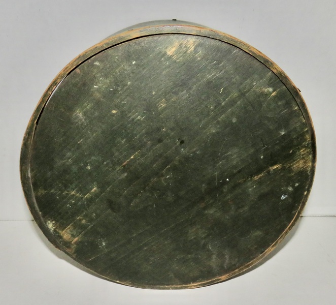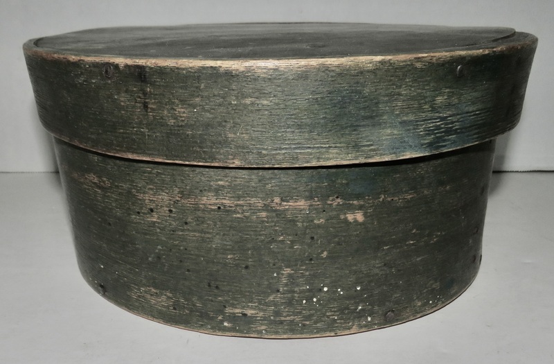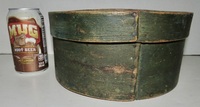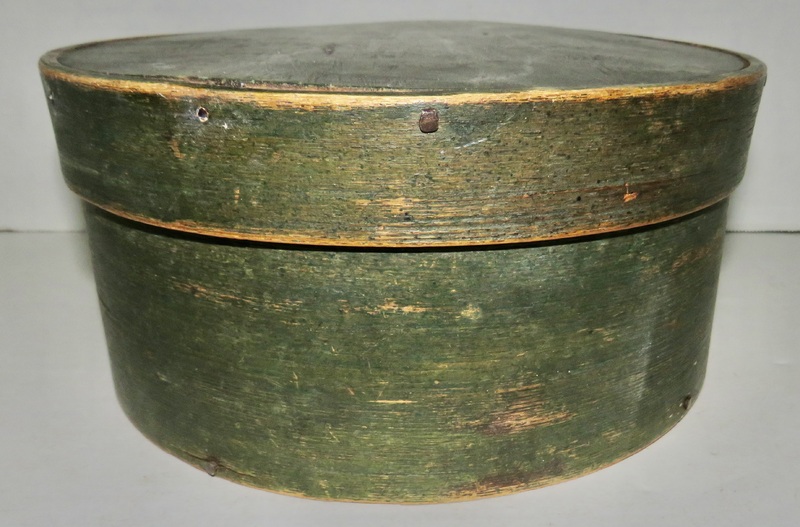 Early 19th century, ca.1840, thick walled pantry box with original forest green paint and wooden pegs and hand cut very early nails. Great surface and no issues. 9 3/4” x 4 3/4” tall.