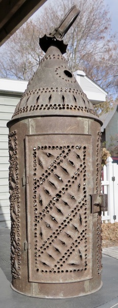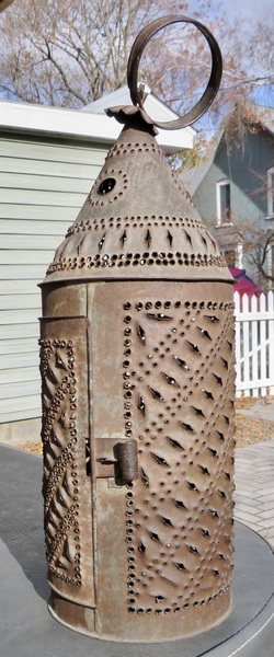 18th - early 19th century punched tin barn lantern. Uncommon diagonal punched designs. Cleated or tabbed through bottom candle cup. Soldered and folded seams. Door latch is on the right side. Lots of soot in the dome. Original carrying/hanging loop handle. 17” hanging height x 5 1/2” dia. base. No issue.