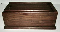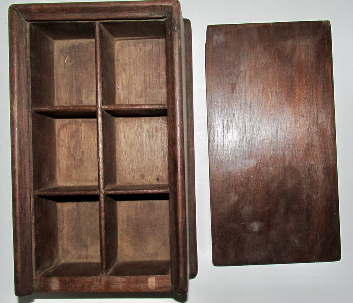 Slide lid table spice box, walnut, c.1760-1780, raised panel lid and dovetailed with T-Head nails in base, 9 3/4” x 5 3/4” x 3 1/2” tall, very tight stable crack in lid next to panel, very smoothly worn surface with wonderful patina, American, possibly of PA origin. It came out of the collection of Mark Teller in PA.