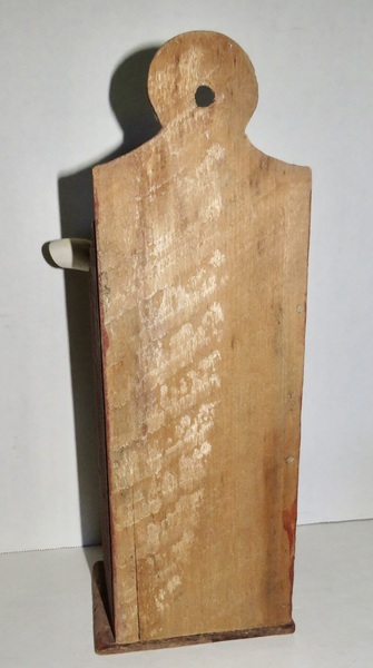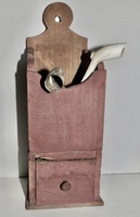 Early 18th century, ca.1720-1760, pipe box with very dry original red wash paint. Pit sawn boards. All wooden peg construction, no nails. the scalloped sides and front were all hand carved. Original dovetailed drawer with original brass pull. 13 1/2” tall x 4 3/8” wide x 4 1/4” deep. Pipe compartment is 5 3/4” deep in front and 6 1/4” deep at the back which helps to date it to early 18th c. when clay pipes were 6” long. Pipes were typically longer, 7-8” or more after 1760-1780. An unusual feature of the early primitive pipe box is that the bottom, inside of pipe compartment, and outside bottom of pipe drawer have red paint. The inside of the back board was left natural, suggesting that possibly the boards were painted when used to make the pipe box. There are small pieces missing from the corners of the board above the drawer. The wear and darkened stains are super and indicate good honest wear over the past 300 years. Rare this early. Pipes not included.