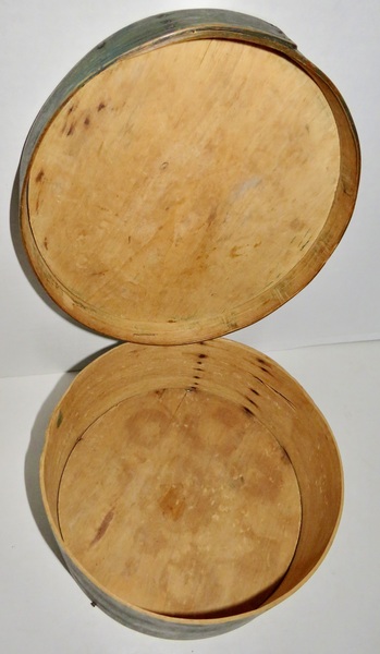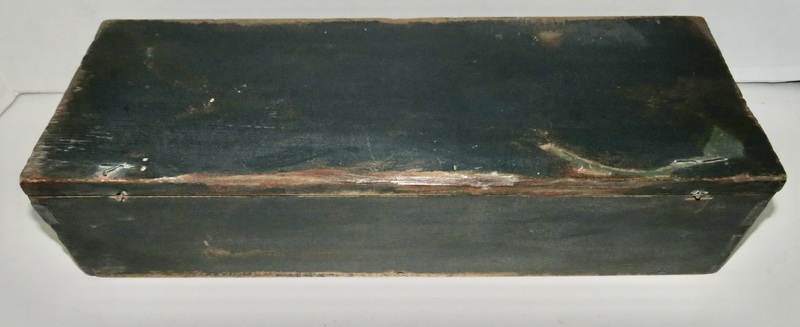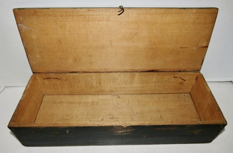 Just a wonderful early storage box that oould have been used for candles. It has dovetailed construction with original snipe hinges and wire closure. It measures 14 1/2 long x 5 1/4 wide x 3 1/2” tall. It retains most of its original very dry blue paint that has mostly oxidized to a greenish color. Late 18th century. Great condition with good honest wear.