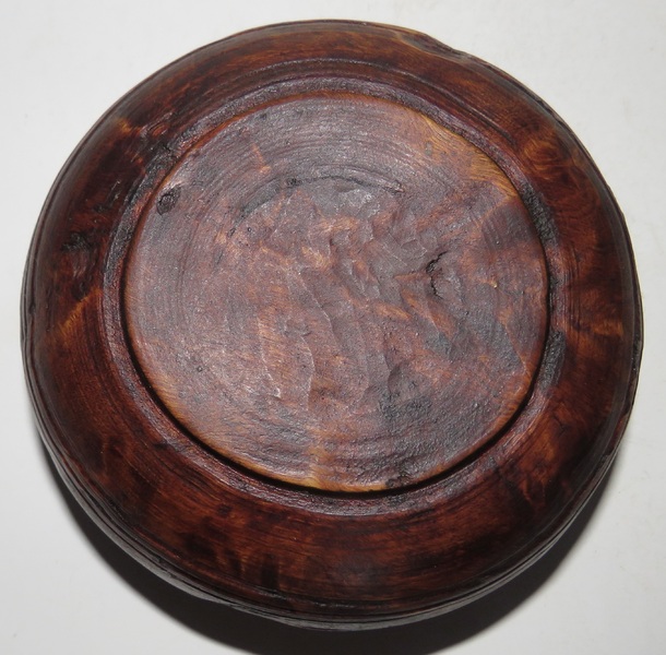 Eating bowl, fruitwood burl, rare small size, 5” x 1 1/2”. There are traces of original red paint remaining. There are a few insect tracks and holes from before it was lathe turned. 17th or early 18th century. Very rare to find this early and a small size.