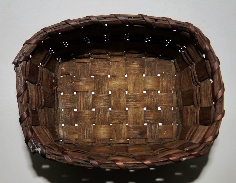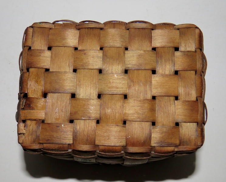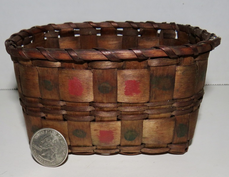 Very small basket having original potato stamp design in red and green paint. Possibly Native American. Only 4 5/8” x 3 5/8” wide x 2 5/8” tall. One well done repair using 2 narrow splints. Rare small size.