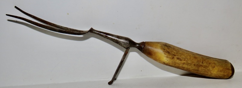 18th century, ca.1760-1780, two tine serving fork. stag horn handle with iron cap. Iron stand piece folds down. 9 1/2” o/a.