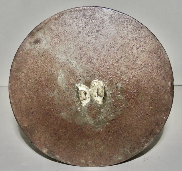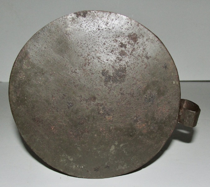 Uncommon American heavy sheet iron candlestick with a chair hook, saucer base and peened through push-up shaft. Brass knob on height adjustor. 7 3/4” tall with a 6 1/4” x 1” deep saucer base. Ca. 1780’s. No issues. Not common.