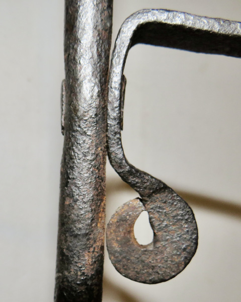 Rare 18th c. forged iron lighting or utensil rack, would have driven spikes into wall, the curl on center of bar holds the rack away from the wall to hang items, 13” wide x 8 3/4” tall, wonderful iron work, decorative pieces wiggle slightly but are secure and stand upright as they should.