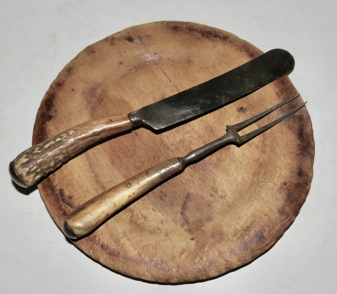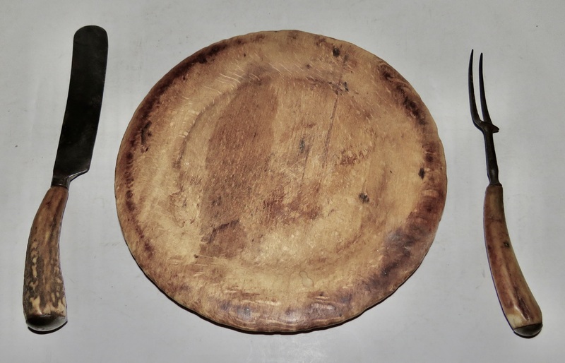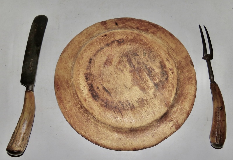 Early 18th century treen eating plate with fork and knife. Maple wood was pole lathe turned. Measures 7 1/2" x 5/16" tall. Included with plate are an 18th century table knife and a two tine 18th century fork. Knife is 8" long and fork is 6 1/4" long. Antler horn handles on both pieces. No issues. These look great displayed as a table setting.