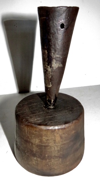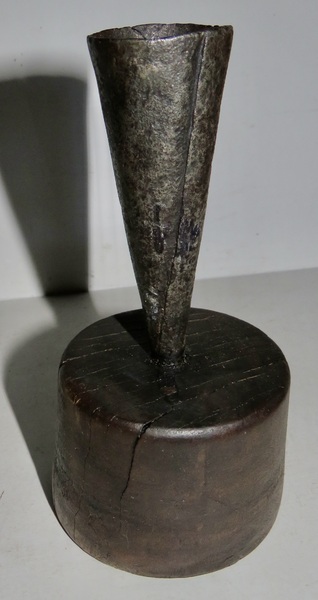 Offered here is a very rare style spike cellar candle holder. It has a wooden handle, a tin candle socket and a round iron spike for driving into a wooden beam. A very unusual form. Came from a very good PA lighting collection. 18th/19th century.