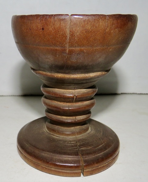 One of the best treen goblets I have owned. It is cherry wood and has original reddish paint. Pole lathe turned and a nice size. Super untouched, very smooth worn surface. 4 5/8” tall x 2 ¾” top diameter x 2 5/8” bottom diameter. No issues, just a very nice goblet that would look great on a tavern table or shelf.