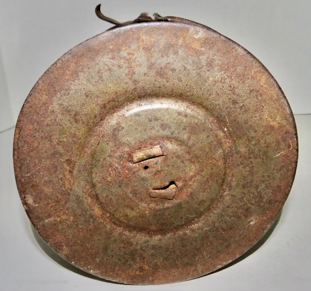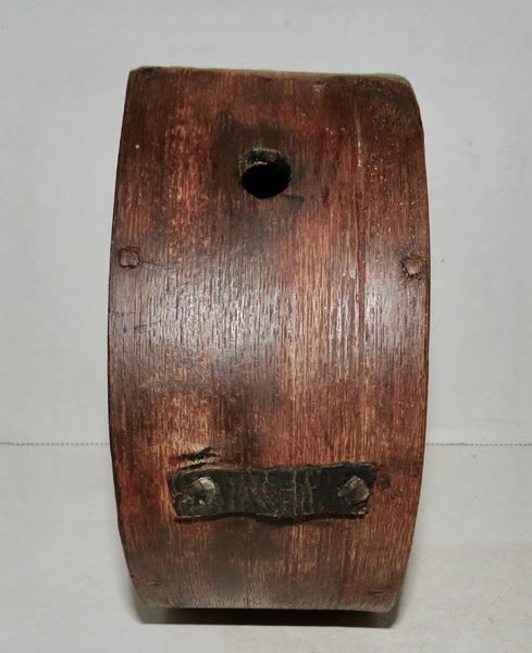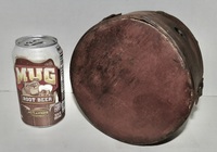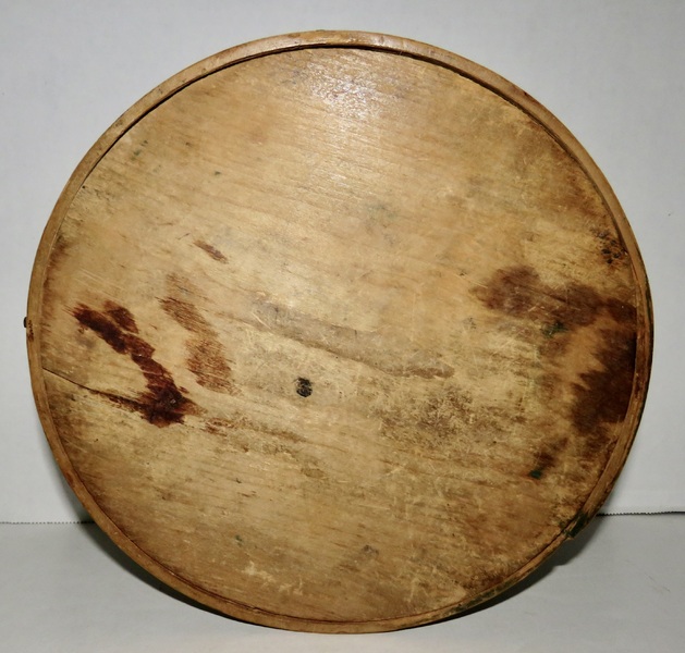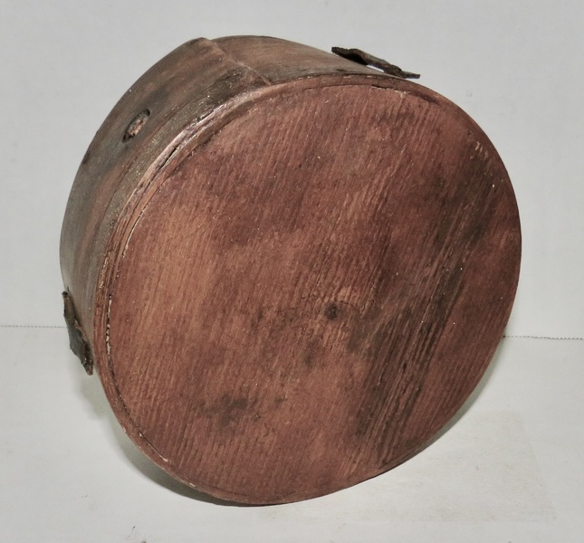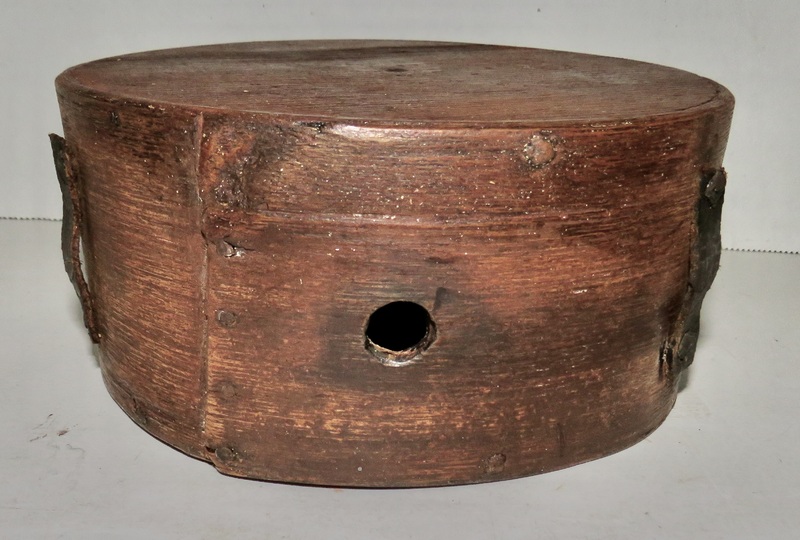 Rev. War era cheese box canteen. Reddish brown stain. 6 1/4” x 3” wide. Original strap guides for shoulder strap. No issues. Great example.