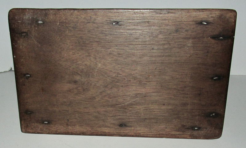 This document box, having a leather cover and super nice wallpaper inside, is one of the best I have owned. It has rose head nails securing the hasp and on the bottom of the box. It is only 12” x 7” x 6” tall and has a domed top. There are hand-tooled designs in the leather all around. The document box has the original leather hinge and white leather trim with brass tacks. C.1750-1780 period. No issues.