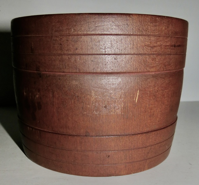 Rare vinegar painted New Hampshire pantry box. Thick walled. Iron tacks in laps and wooded pegs. 8 1/4” top diameter and 8 1/8” bottom diameter x 3 1/2” tall. Rare to find this nice. No issues. Early 19th century.
