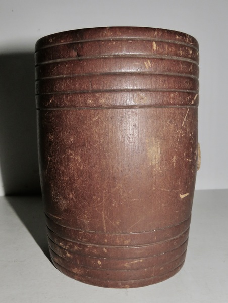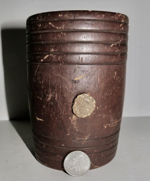 Very scarce early 18th century mortar & pestle, both made from beautifully grained Lignum vitae wood. The mortar is 6 1/4” tall x 6 1/4” diamete and the pestle is 10” long with a 3” diameter base. There are no issues, just natural shrinkage cracks in heart wood. Good lathe turnings with fine line carvings. Early to mid 18th c.
