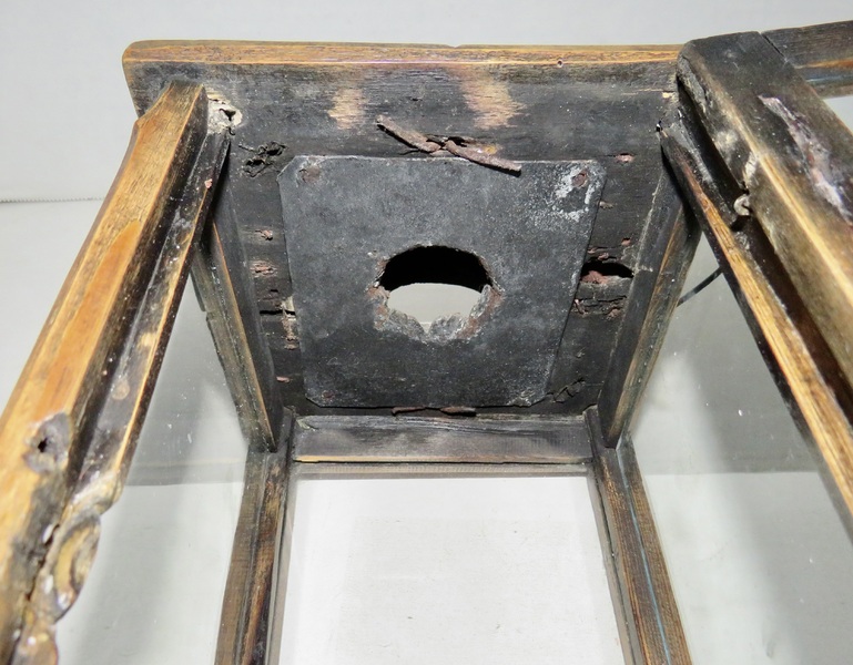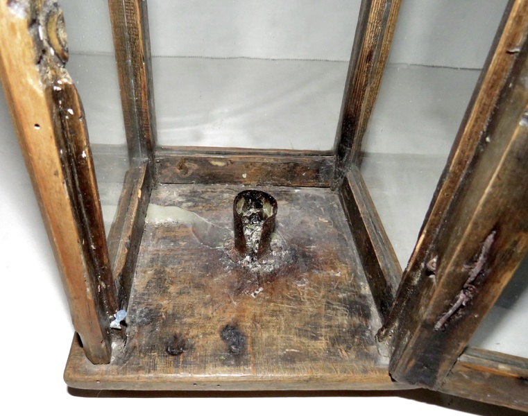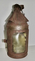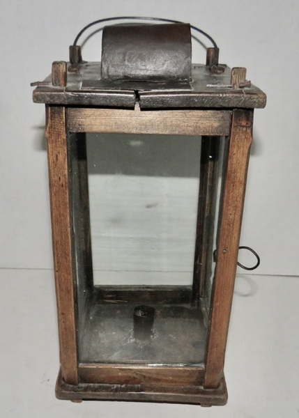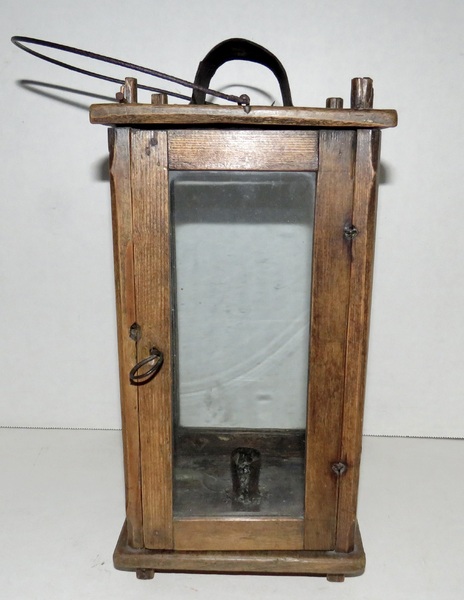 18th century wooden (maple) barn lantern. All original with smoke bell and snipe hinges. No sign that the glass has been replaced. Wooden pegs in the feet and square nails in the top of the posts. Candle cup peened through wooden base. Lantern is 10” tall x 5 3/4” x 6” and 16” hanging height. Tin plate in top vent hole with much soot from burning candles.