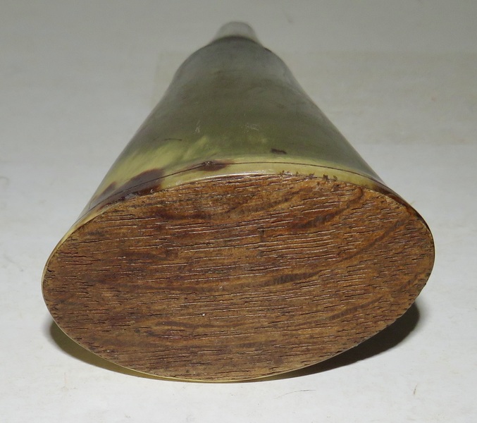 Early powder horn having carved spout and wooden end plug fastened with iron nails and having strap loop. 7” o/a length. 18th c.