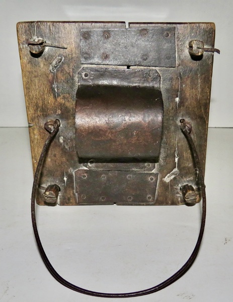Forged iron birdcage lighting device with a wooden base. Remains of original shellac or varnished surface. 9” tall with a 4 1/2” x 1” base. Probably French or English. Ca. 1750.