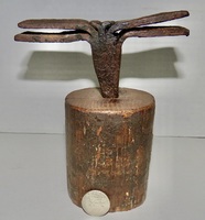 Not your ordinary heart trivet, this hand forged PA trivet is in a rare "bleeding heart" shape. The 3 legs have rare shoe feet and are tapered. Untouched surface. 7 5/8” x 5” x 2” tall. Unusual style to have both points on the heart curved, hence, a "bleeding heart". 18th c.