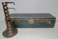 Spiral candleholder; tinned sheet iron wax catcher pan with a 1/4” rim; 3 forged legs; peened through spiral; original or early wooden candle lifter with a rosehead nail for turning (nail may be newer); 7 1/2” tall with a 4 1/2” dia. tray; carrying arm/chair hook; mid-18th century. Wooden candle lifters were commonly used in the period.