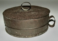 Very rare ca.1680-1720 forged iron tavern ale warmer with attached original lid. 5 1/2” to lid x 3 1/4” diameter base. Minor rust holes in lid but nowhere else. It appears to have a brass wash on the surface. This is the only forged iron ale warmer I have ever seen.
