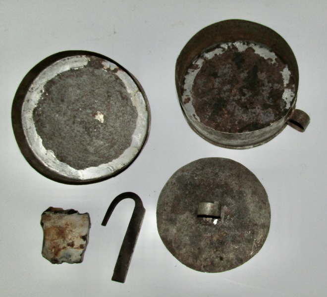Not ofter seen is this tinned sheet iron tinderbox with striker, flint, damper, finger ring lift on lid for starting fires in the 18th century. Made with fine tinsmith work, it is 4 1/2” D x 1 1/2” T. Minor surface oxidation, no issues, c.1780-1820.