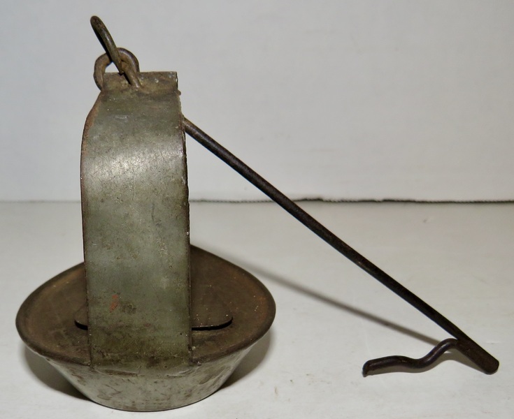 Grease (Crusie) lamp. For use, the pan was filled grease, fat scraps, fish oil, veg. oil, and after c.1760 whale oil. A simple wick or rag in the slot fed from the fuel. It has the original attached wick pick, wick holder, and a hanging spike. Measurements are: 5 1/4” x 3 1/2” x 3/4” pan and 10 3/4” hanging height. Ca. 1680-1740. This piece is an early transition to Betty lamps with the added wick channel.