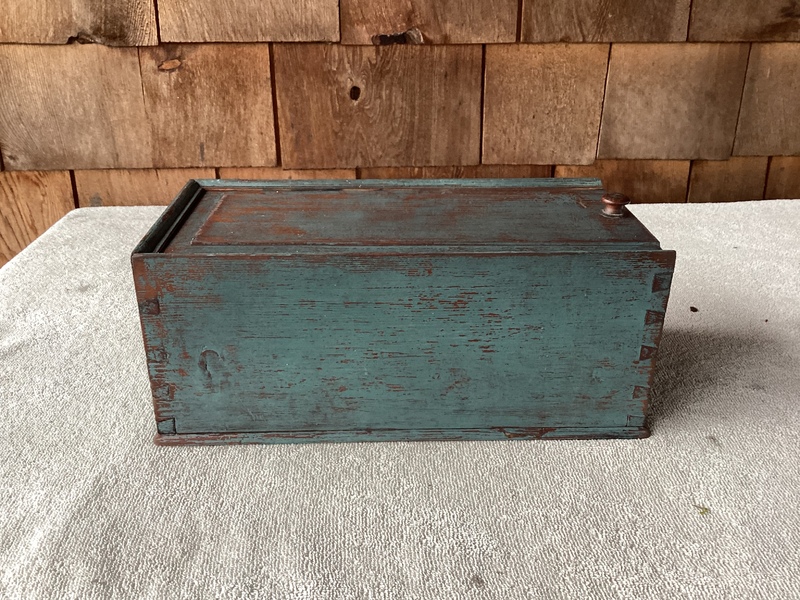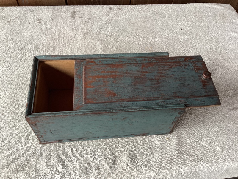 Great New England Slide Lidded Candle Box. Hand Dovetailed. Chamfered Top. Fabulous Worn Old Original Blue Paint. Measures 12” long X 6” wide X 5” tall. More pics available.