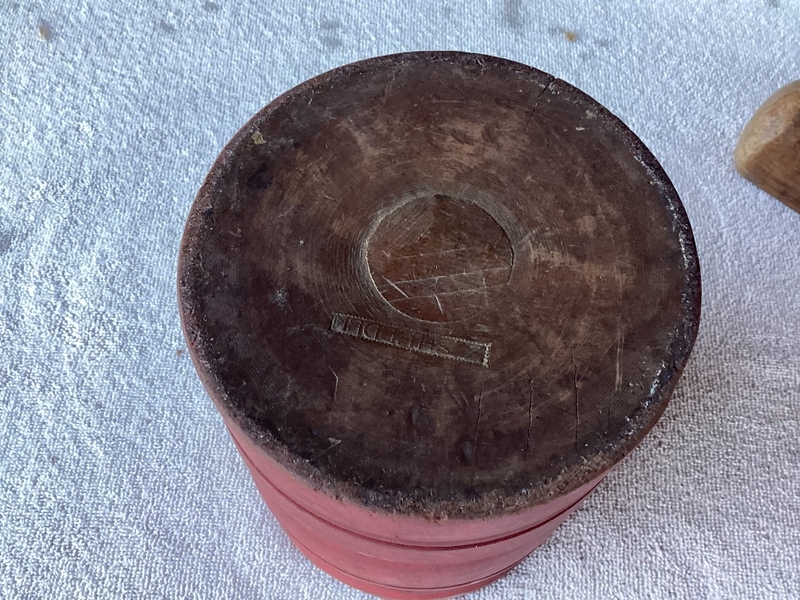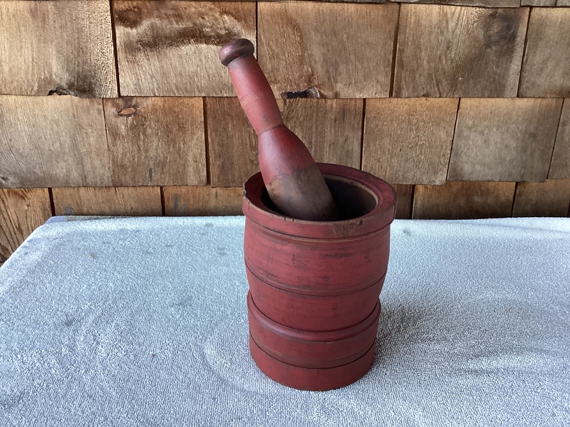 A Great Early Mortar & Pestle from my Personal Collection. Unusual Turn Lines, Gorgeous Old Cherry Red Paint. Named Stamped on the Bottom. Mortar Measures about 7”. More pics available.
