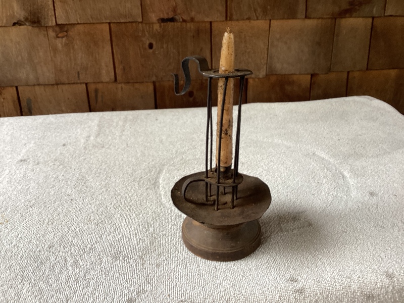 From my collection. A rare Early Birdcage Candle Holder. Metal with a wooden Base. Measures 8” tall. Just a great Very Early hard to find lighting piece. More pics available