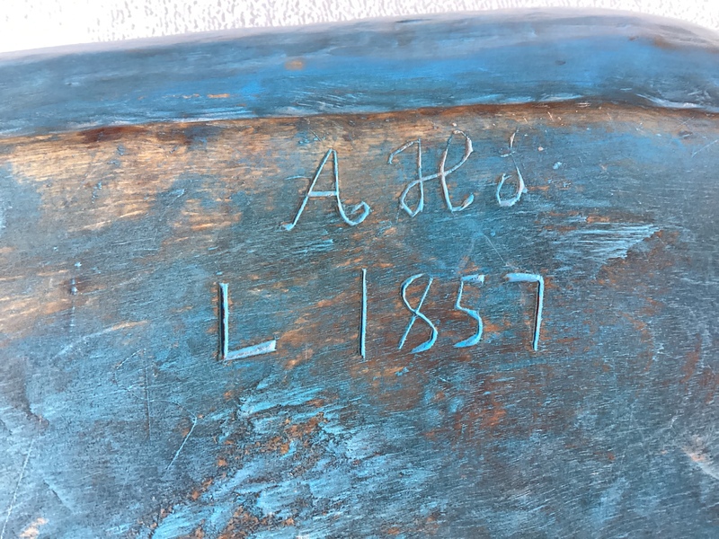 Rare Beauty!!! Stunning Dated 1857 Hand Hewn Trencher. Fabulous Original Blue Paint. Old Repair. Signed and dated on the Bottom. New England find!!! Measures 16” long X 9 3/4” wide X 3 3/4” deep. More pics are available.