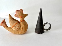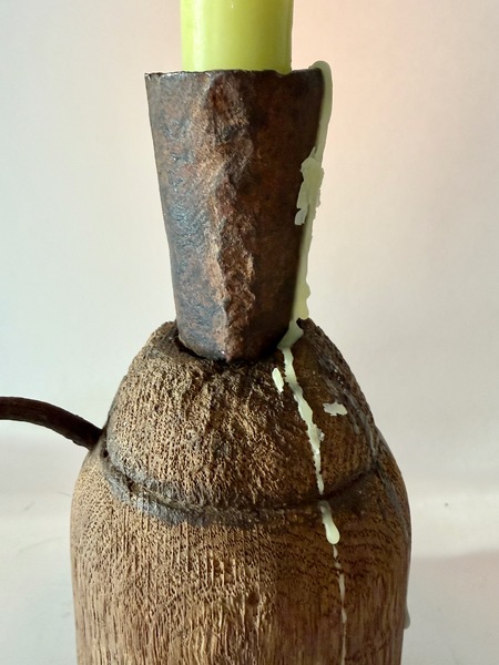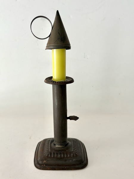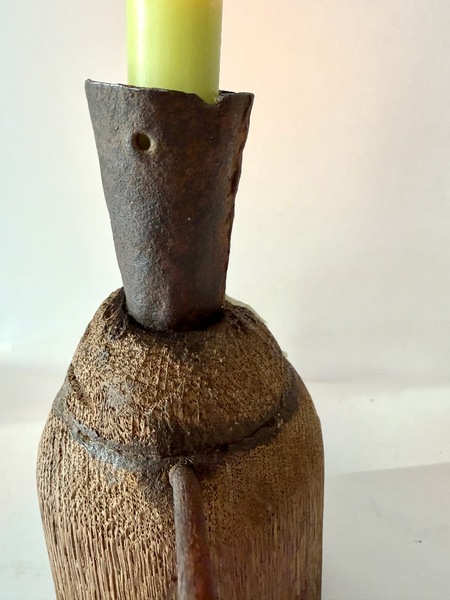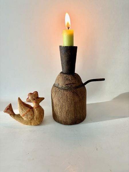 In colonial America and the early Republic period manufactured goods were scarce and expensive. Families often repurposed broken or worn objects into useful household objecls. A "make-do" candleholder, might combine a salvaged iron candle socket mounted on a carved wooden block. This is a very early and primitive example. Unusual is it has an iron lift which makes it easier to transport. It is 10" h. x 3 1/2" diameter. We offer a layaway plan.