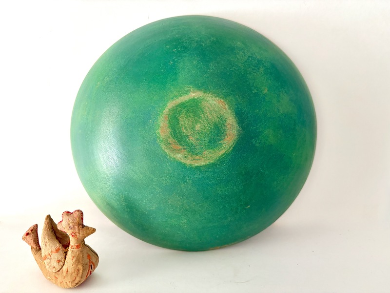 The painting of antique wooden bowls became popular during the 18th and 19th centuries. The paint was decorative and attractive. The paint also served to hide burn patches, scratches, stains etc. The paint on this bowl is late 19th or early 20 th century. It is quite lovely showing appropriate wear. 11 1/2" x 12 14" x 3" h. We offer a layaway plan.