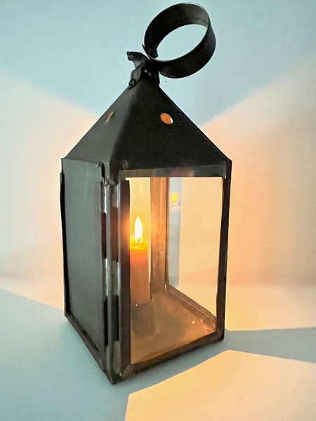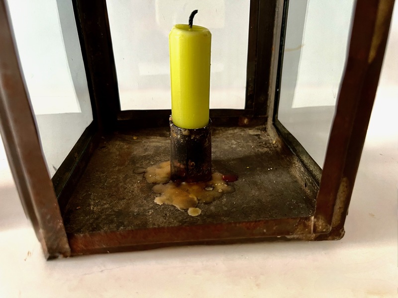 These antique lanterns were practical lighting devices prior to electricity. They provided the best light spread when hanging. They had multiple uses in both the country home and out buildings. This lantern is in very good condition. The tin sliding door allows for candle replacement. The glass panes are early a bubble or two can be seen. The candle socket is cleated through the base, dating the lantern. The tin has oxidized over time. A special early antique lantern. 14" overall x 5.5" square. We offer a layaway plan.