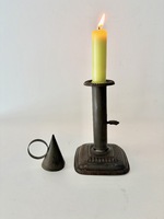A fine 19th c., push-up candle stick with a 19th c., candle snuff. Both are in very good condition. Check photos to see the decoration on the base of the candlestick. 6" x 3 1/2" base. We offer a layaway plan.
