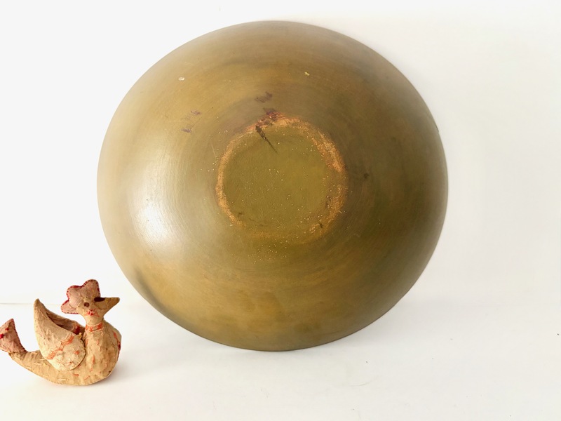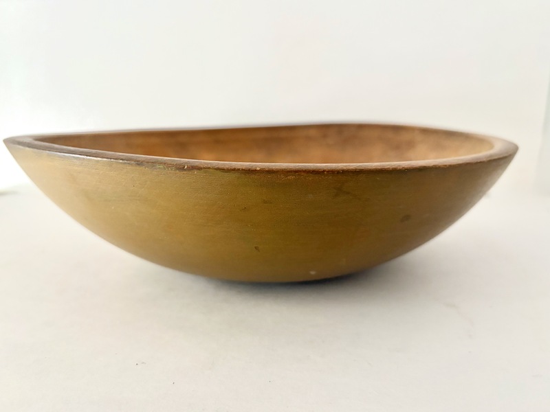A very nice New England maple bowl in a deep mustard colored paint. The bowl is clean and in very good condition. 11"x 10 !/2" x 3". We offer a layaway plan.