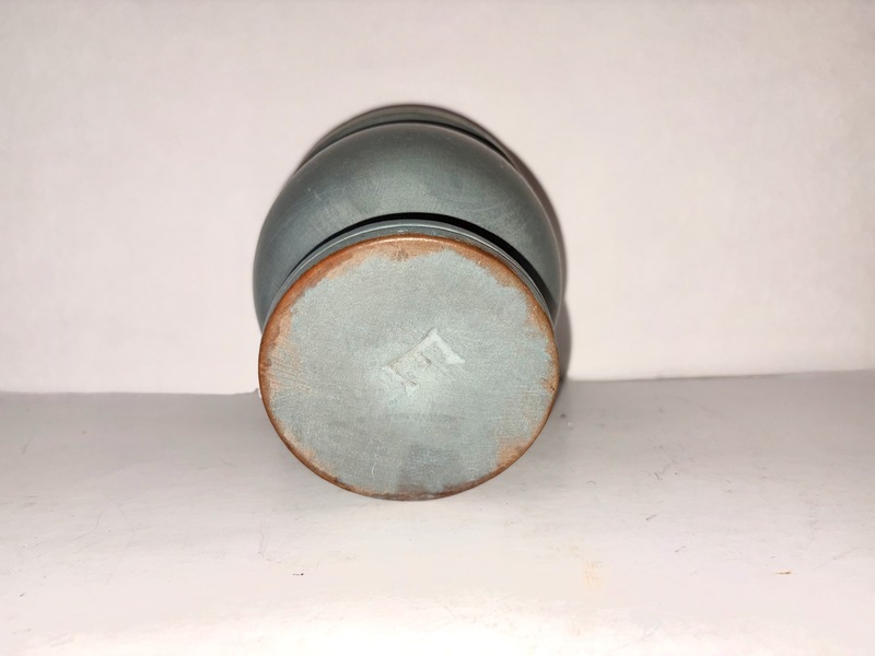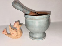 This antique mortar & pestle have a unique blue/gray colored paint. It is in very good condition with appropriate paint wear.
