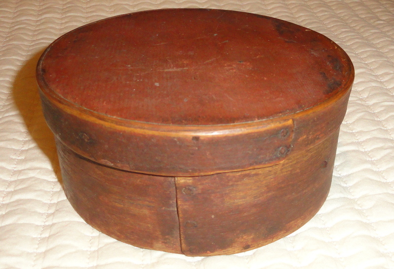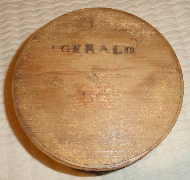 6 3/4" diameter round pantry box in honest, old, original red paint. Constructed with wooden pegs and iron tacks, the box is in nice condition with no losses. There is a glued hairline crack running parallel to the top and bottom but is barely noticeable and only mentioned for accuracy. The red paint is fabulous on the lid, but there is more wear on the base. Branded on the bottom "GERALD" as show. Rare maker's mark.