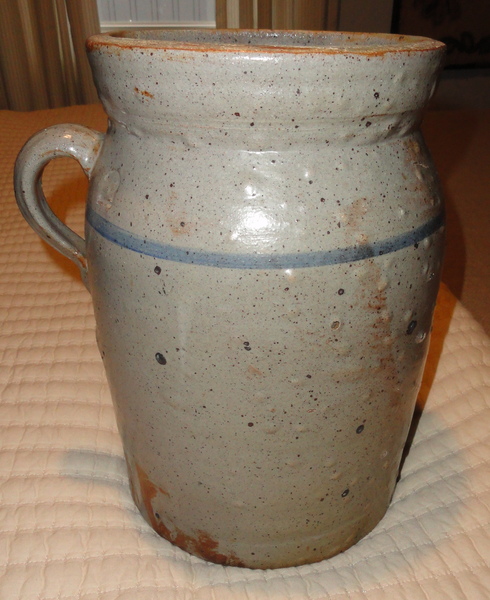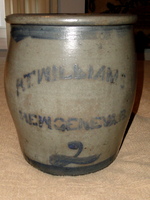9 3/4" tall stoneware cream pot with two cobalt blue stripes and a "2" in addition to the stenciled maker's mark of "RT. WILLIAMS, NEW GENEVA, PA". Semi-ovoid form with out-of round top rim. Excellent condition with a very minor chip on the inner top rim. No cracks, lines or repairs. Circa 1880-1890.