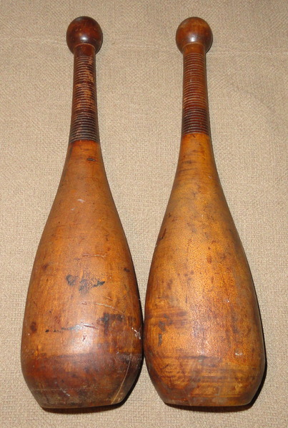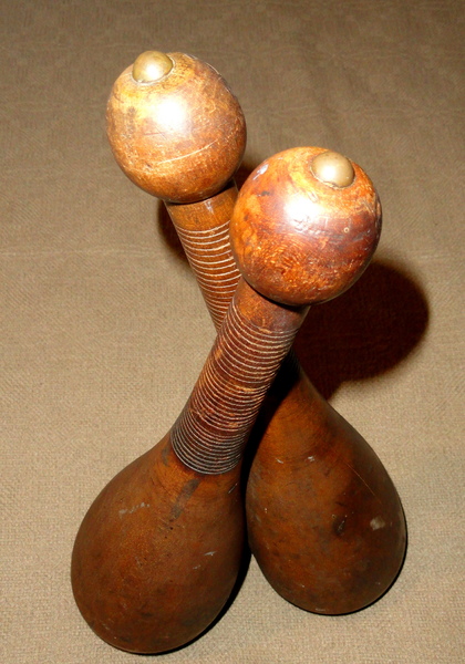 This pair of American made 2 pound Indian clubs were turned with an unusual bulbous bases and date to around 1890-1900. Used for exercise routines that were popular during the Victorian era, this matched set of clubs feature the original brass tacks on top and and original surface. Very Good condition. Height 16 3/4".
