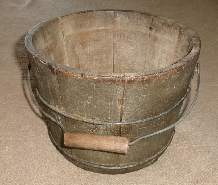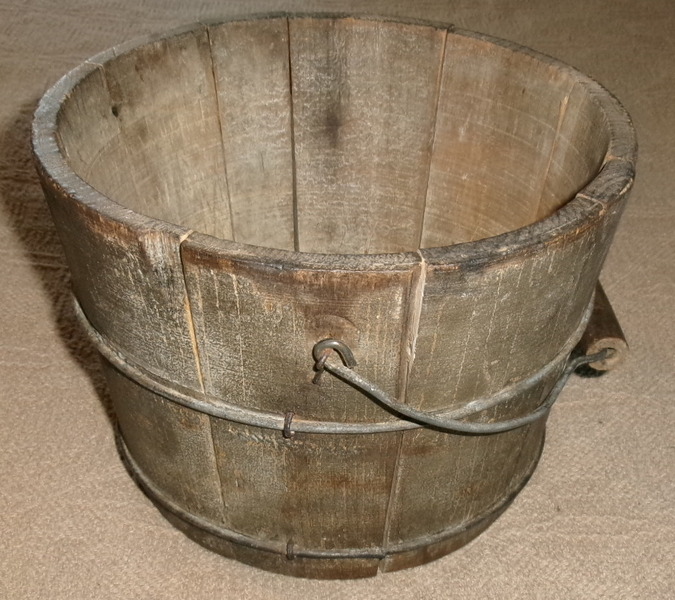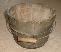 Very nice primitive wooden bucket with two wire bands and a wood and wire bail handle. Retains a very old, honest silver-grey surface. Nice and tight and in very good condition. 6.5" tall x 9" in diameter at the top.