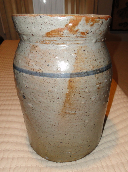 11.5" tall one-handled 2 gallon primitive stoneware butter churn with one single cobalt blue stripe. The crock has an inordinate number of stones in the clay, only a few of which "popped", throughout as shown. There are no chips, cracks, lines or repairs and is essentially just as it was when it was made. The form gives a strong indication that it came from the Southeast, reminiscent of Jugman Johnson. Weighs 10 pounds.