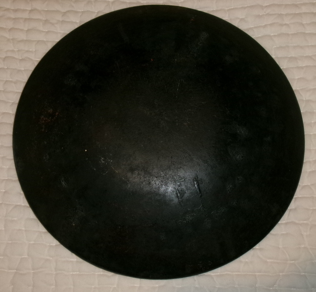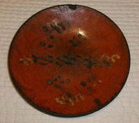 9 3/4" in diameter redware plate. As you can see, it shows significant slip loss with a chip and a hairline crack. Still, excellent color and priced accordingly. $128 shipped.