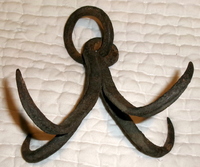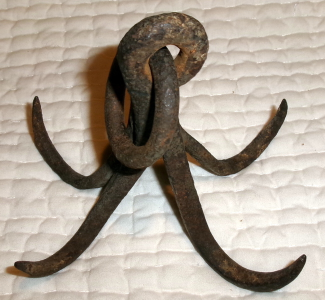 This is an 18th Century blacksmith made 4 prong meat hook that was found on an old Salem County New Jersey farm many years ago. It has a great old surface and it measures only 6" x 6". Great item for the kitchen or hearth.