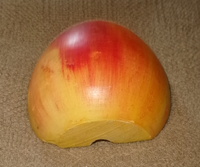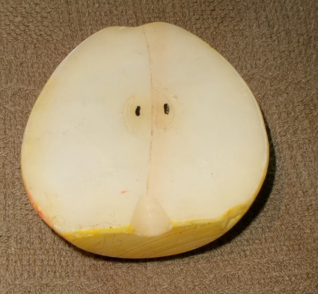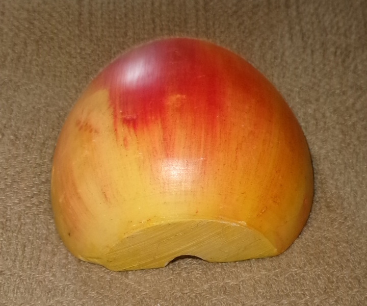 Beautifully carved and painted oversized half apple stone fruit. It has a flat section on one end so it can stand up. 4" x 3 3/4" x 1 3/4". Weighs over one pound.