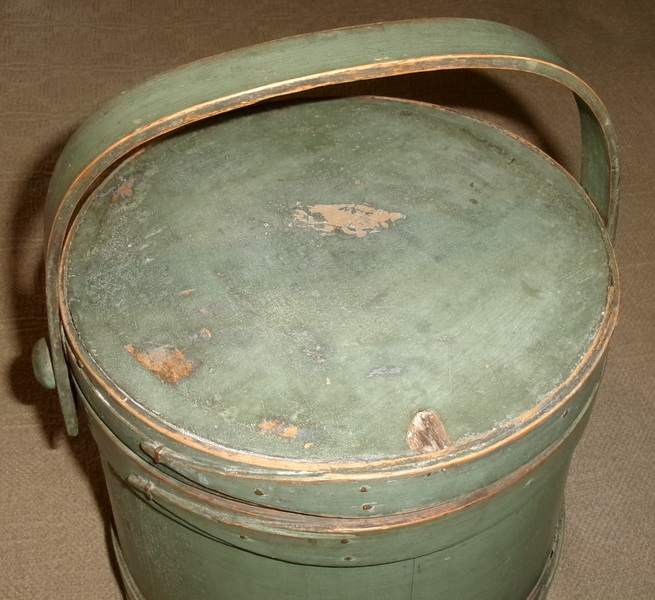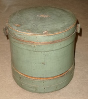 This 10 1/8" diameter at the base firkin retains an old and unusual colored light teal green paint. It has good honest patina and wear. There is a very well-done old, make-do repair to a crack running through the band on the lid. Someone skillfully used thin wire to secure the crack. To some, this enhances the value and charm to the piece. There is a stamped maker's mark on top of the lid that is hard to read, but I've narrowed it down to "B. R. JENKINS". Overall, good condition. Late 19th C.