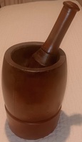 A 8.25" tall x 6" diameter mortar & pestle in nice old red paint. There are two tight cracks but overall it is in fine condition.