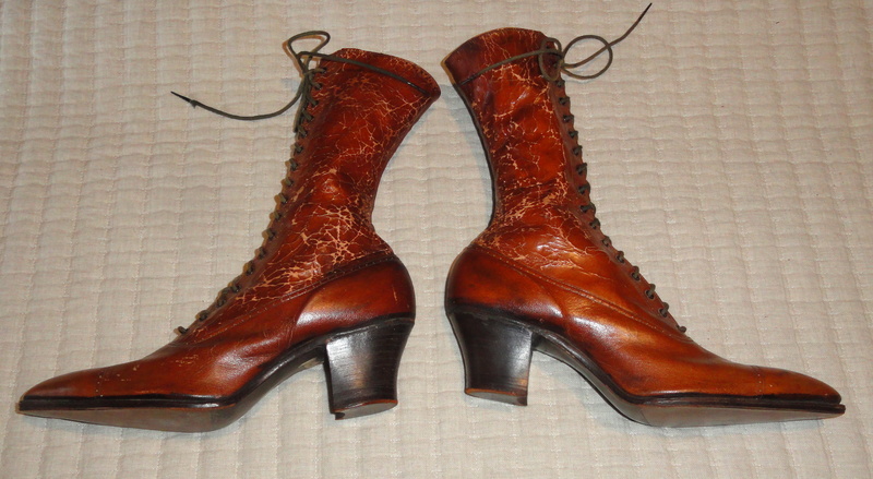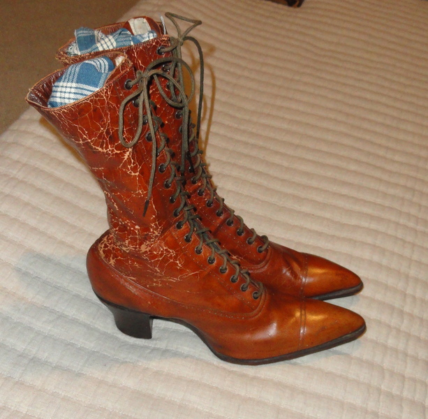 10" tall x 10" long pair of lace-up ladies' light brown shoes that date to the early 1900's. There is crazing to the upper leather parts but a treatment of shoe polish would improve this I am sure. The soles and heels show very little wear, probably because they were impossible to wear because of the narrowness of the toe box! Makes for a great display!!