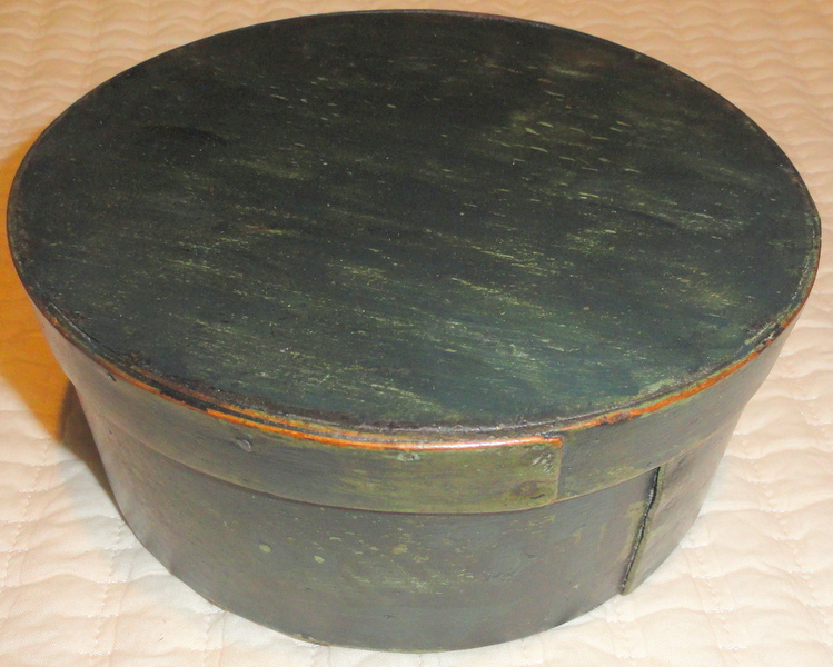 Here's a great 7 1/2" New England pantry box in wonderful original green paint. Constructed with iron nail and wooden pegs, the box is in excellent condition. From the estate of Ron and Diane Wolrab of Salem, NJ.