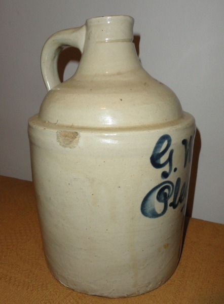 There are only a handful known of Pleasantville, New Jersey stoneware script jugs such as this one. George Washington Leech operated a general store in Pleasantville in the early 1900's. Attributed to Fulper Pottery of Trenton and Flemington, NJ circa 1900, this one-gallon jug is in excellent condition. There are just a few flaws that were from the kiln, mainly a glazed-over chip at the shoulder as shown. Wonderful vibrant blue hand-done script under a Bristol glaze. 11" tall x 6 3/4" diameter.